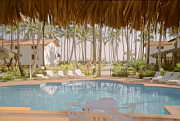 Beim Essen blickt man ueber den Pool Richtung Meer