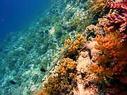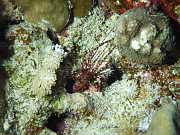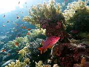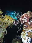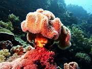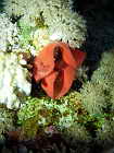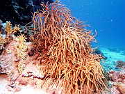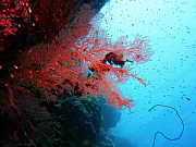 eine rote Gorgonie an der Steilwand, unten sieht man noch eine Spiralen-Drahtkoralle