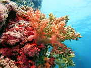 verschiedene Haarsterne auf dem Riff filtern das vorbeistroemende Wasser nach Nahrung