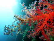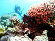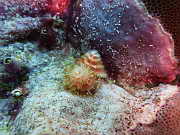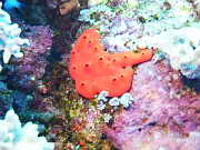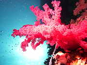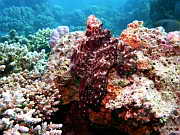 ein roter Krake, auch Oktopus genannt unter einer Geweihkoralle