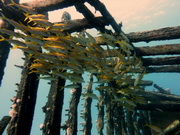 Schwarm Gelbflossenmeerbarben im Wrack eines gesunkenen Tauchschiffs