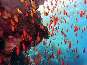 schoener Farbkontrast zwischen dem tuerkisfarbenen Wasser und den Fahnenbarschen