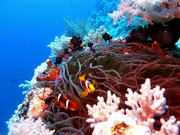 Rotmeer-Anemonenfische im Vordergrund und Dreifleck-Preussenfische dahinter