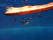 junge Pilotfische unter Treibholz (erwachsen oft mit Haien unterwegs)