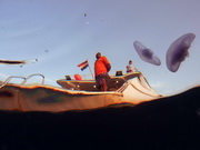 Cache betrachtet argwoehnisch die Tentakeln einer Qualle und fotografiert sie