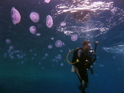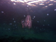 lustig verschwommener Blick durch die Wasseroberflaeche mit Ohrenquallen auf die Sharky