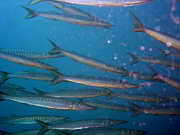 ein Schwarm Barakudas zieht durchs Freiwasser