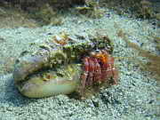 Ein Einsiedlerkrebs schaut aus seiner Muschel