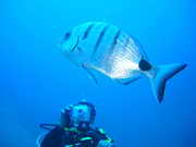 ein Streifenbrachsen schwimmt Mike vor die Linse