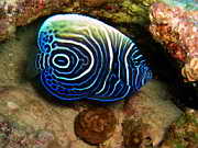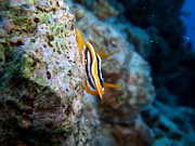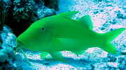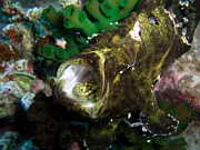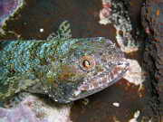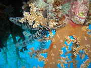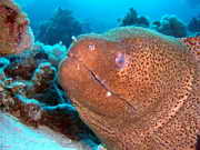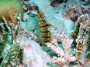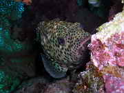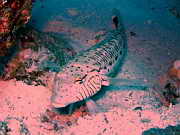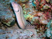 eine Gelbmaulmuraene wagt sich weit aus ihrer Hoehle und zeigt die schoene seitliche Zeichnung