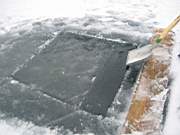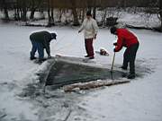 mit zwei Mann wird die gut 20-25cm dicke Scholle unters Eis gedrueckt