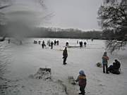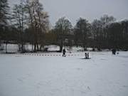 zwischen den Loechern wird der Schnee gekehrt und Wasser aufgegossen, damit es von unten gut sichtbar ist
