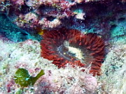 ein Kalkroehrenwurm bildet einen schoenen Farbkontrast gegen das blaue Wasser