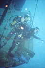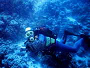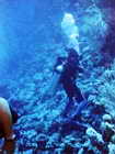 Ein Teilnehmer der Weltmeisterschaft der U/W-Fotographen steht ruecksichtslos im Riff