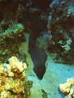 Wer kommt denn da? Eine Muraene schwimmt neben dem Wrack