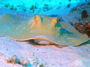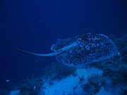 ein Blaupunktrochen schwimmt uebers Riff