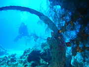 Taucherin und Wrackteil im Vordergrund