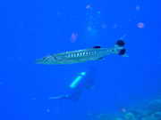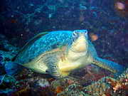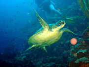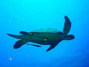immer begleitet von Schiffshaltern schwimmt diese Schildkoete durchs Meer