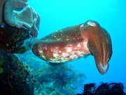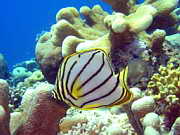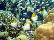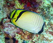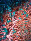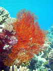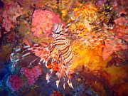 ein Rotfeuerfisch haengt kopfueber am Riff
