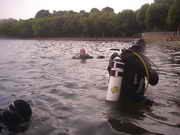 Der Tegeler See im Nordosten von Berlin ist nicht mein bevorzugtes Tauchrevier, kann aber durchaus ueberraschen. Die Sichtweiten differieren zwischen 0,5 und 5 m, meisst so um die 2-3m. Interessant ist vor allem der Bereich bis 7m, es geht allerdings noch ein paar Meter weiter... An den "Kanonen" eingestiegen und Richtung West getaucht, kann man nette Dinge besichtigen. Vorsicht ist immer geboten, da der See von Dampfern, Sport- und Segelboogten und auch Anglern stark frequentiert wird. Auch hat man immer Zuschauer beim Einstieg in den See. Hauptsaechlich Barsche
