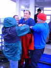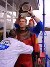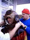 Carsten bekommt als naechster den Helm auf, Luft wird dauerhaft in den Helm gepumpt, ablassen muss man mit seitlichem Kopfkippen gegen ein Ventil
