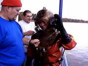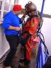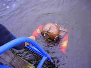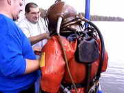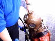 Oberflaechenversorgt durch Atemluft und mit einer Gegensprechanlage im Helm ging es bei ca 60cm Sicht am Strandbad Tegel ins kuehle Nass. Vor dem Spass steht die Arbeit, ganze drei Mann braucht es, um in den Helmtauchanzug zu kommen, eingestiegen wird durch die Halsmanschette