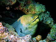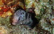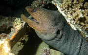 eine Riesenmuraene lukt aus ihrem Loch hervor