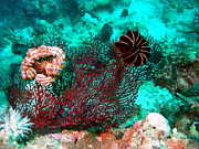 ein paar Haarsterne sitzen auf einer roten Gorgonie