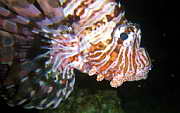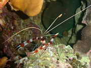 eine rotweiss gebaenderte Scherengarnele bietet ihre Putzerdienste an