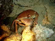 ein Einsiedlerkrebs, der sich ein Spindelschneckengehaeuse als Behausung ausgesucht hat, auf Wanderschaft