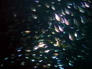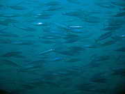 Ein Schwarm Torpedomakrelen oder auch Spanische Makrelen genannt haelt sich am Bug auf